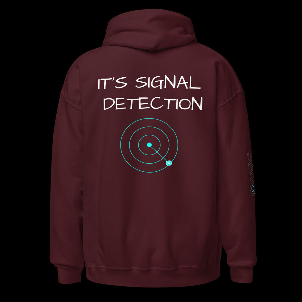 Featuring bold front typography and the Signal Detection insignia on the back, this hoodie pairs perfectly with late-night reflection, creative work, or your next glitch in the Matrix.